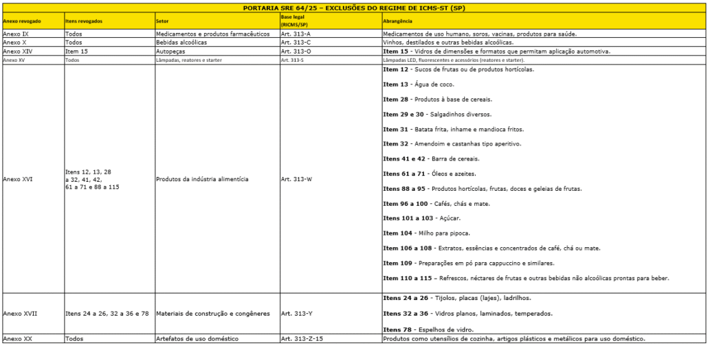 Para melhor visualizar as mudanças, preparamos um quadro com a síntese das exclusões trazidas pela Portaria SRE 64/25: